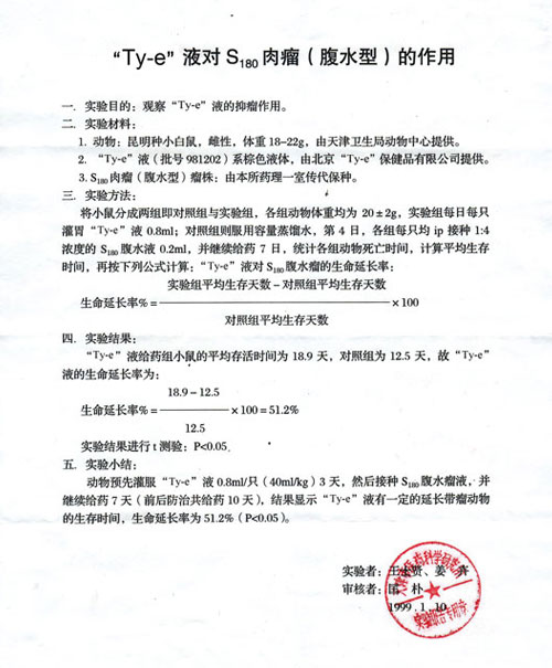 臨床報告編號#11:1999年,天津市醫藥科學研究所-Ty-e液對 S180肉瘤(腹水型) 的作用