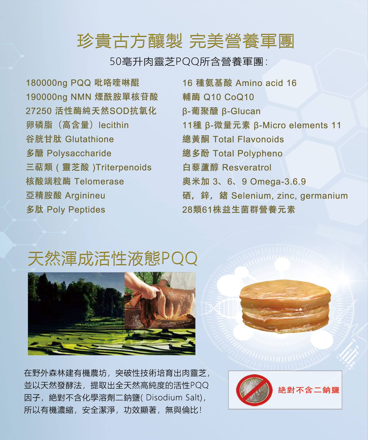 在野外森林建有機農坊,以突破性技術培育肉靈芝,並以全天然發酵法,提取高純度的活性PQQ,絶對不含化學溶劑二鈉鹽( Disodium Salt),所以有機濃縮,安全潔淨,功效顯著,無與倫比!