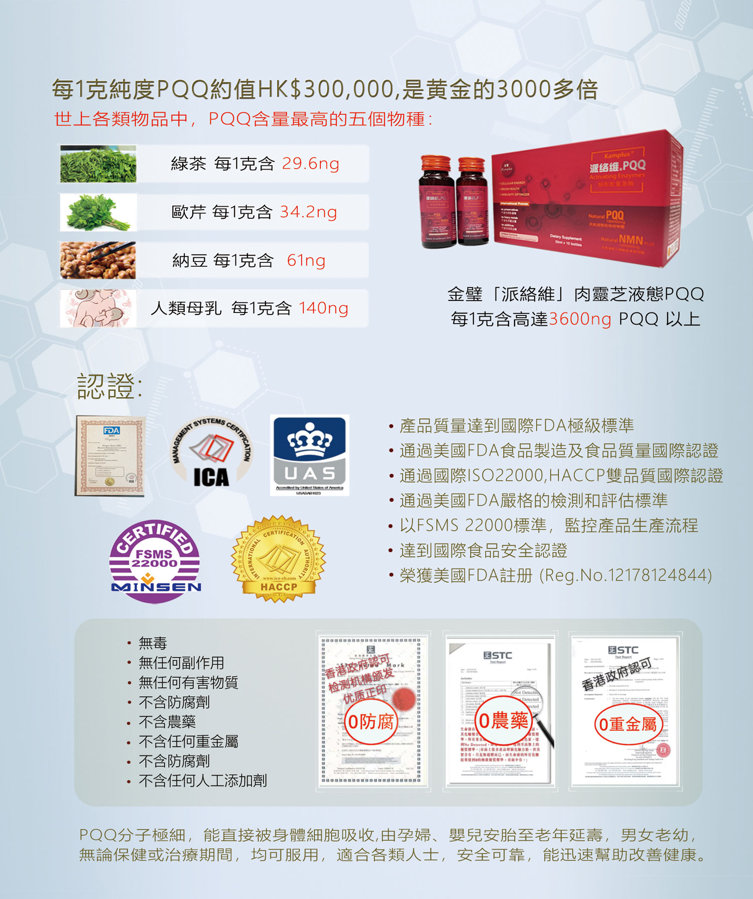 金璧PQQ是純以肉靈芝為珍貴材料,發酵提取珍釀,經大學技術研究院化驗證實含有大量全天然高純度的PQQ,SOD。